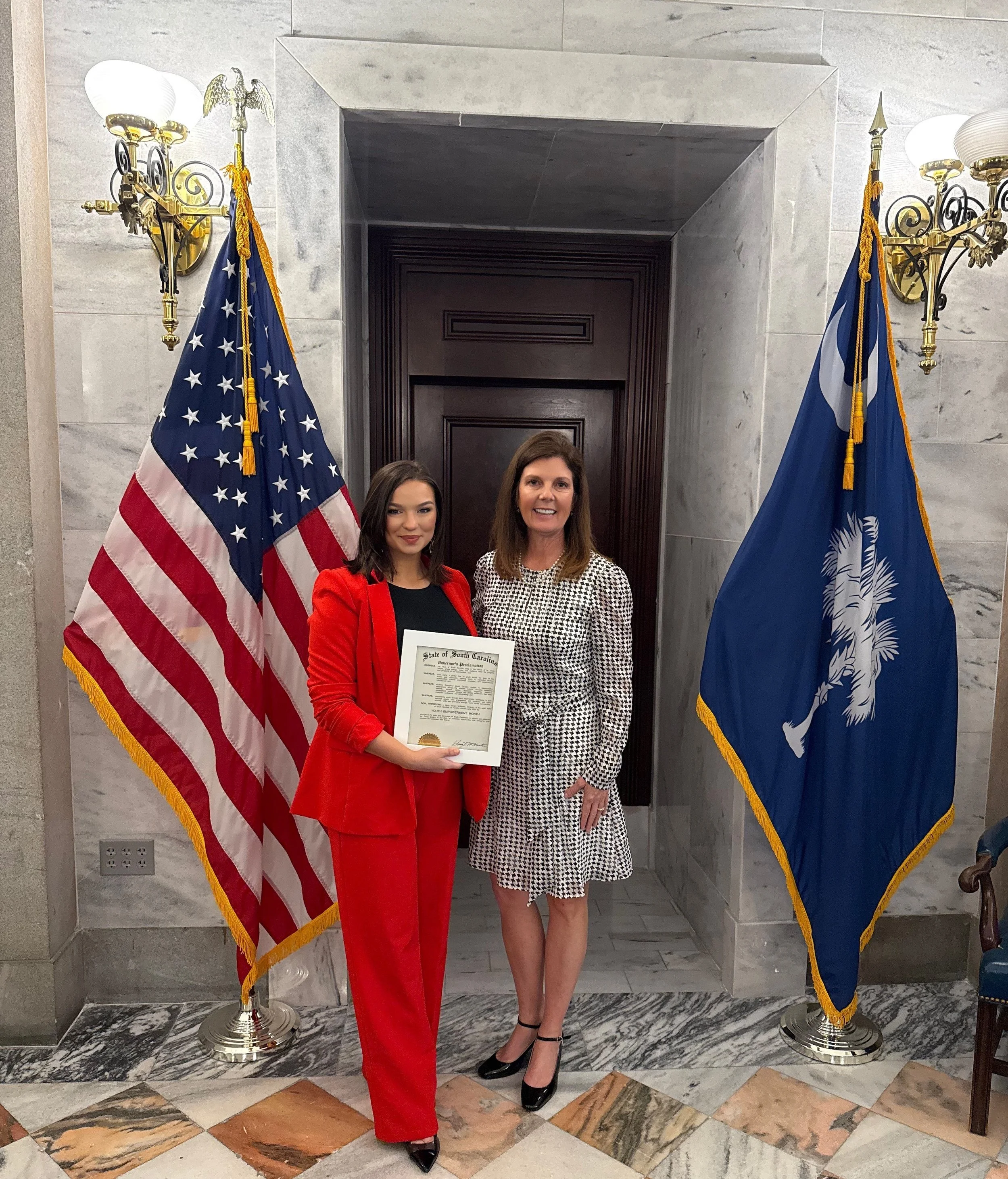Alli Stovall (left), Miss Clarendon 2025 and EYSC Community Engagement Series moderator and workshop facilitator, receives the Youth Empowerment Month proclamation from South Carolina Lt. Governor Pamela Evette at the South Carolina State House in Columbia. South Carolina Governor Henry McMaster has officially proclaimed June 2025 as Youth Empowerment Month, a statewide recognition of the critical role young people play in shaping the future of the Palmetto State.